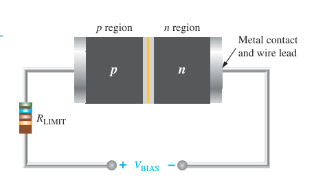 When a forward bias is applied, the bias-voltage source supplies free electrons with enough energy to surpass the barrier potential, allowing them to “climb the energy hill” and move across the depletion region. In essence, as electrons pass through the depletion zone, they lose energy equal to the barrier potential. This energy loss appears as a voltage drop across the pn junction, typically around 0.7 volts. Additionally, there is a slight voltage drop across the p and n regions caused by the internal resistance of the semiconductor material. For doped semi conductive material, this resistance, called the dynamic resistance, is very small and can usually be neglected.