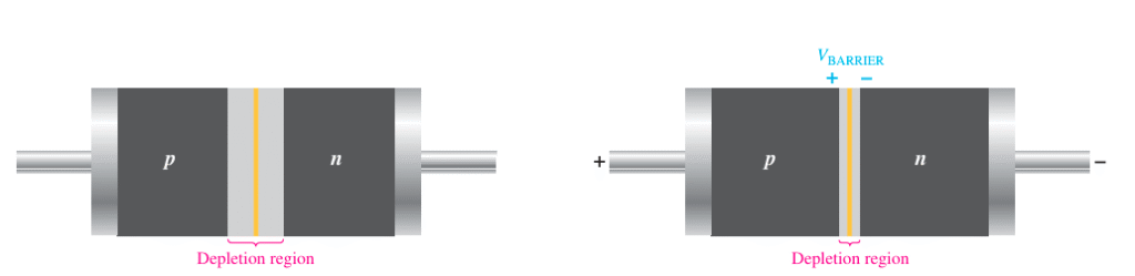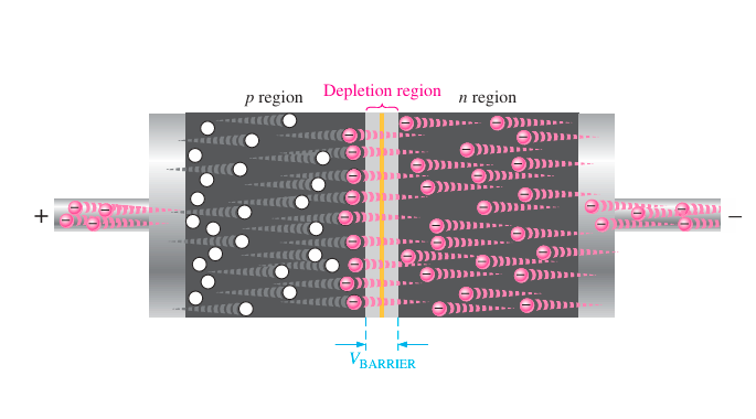Remember, the electric field formed by the positive and negative ions on both sides of the depletion region creates an “energy barrier” that stops free electrons from crossing the junction when the system is at equilibrium. This is known as the barrier potential.